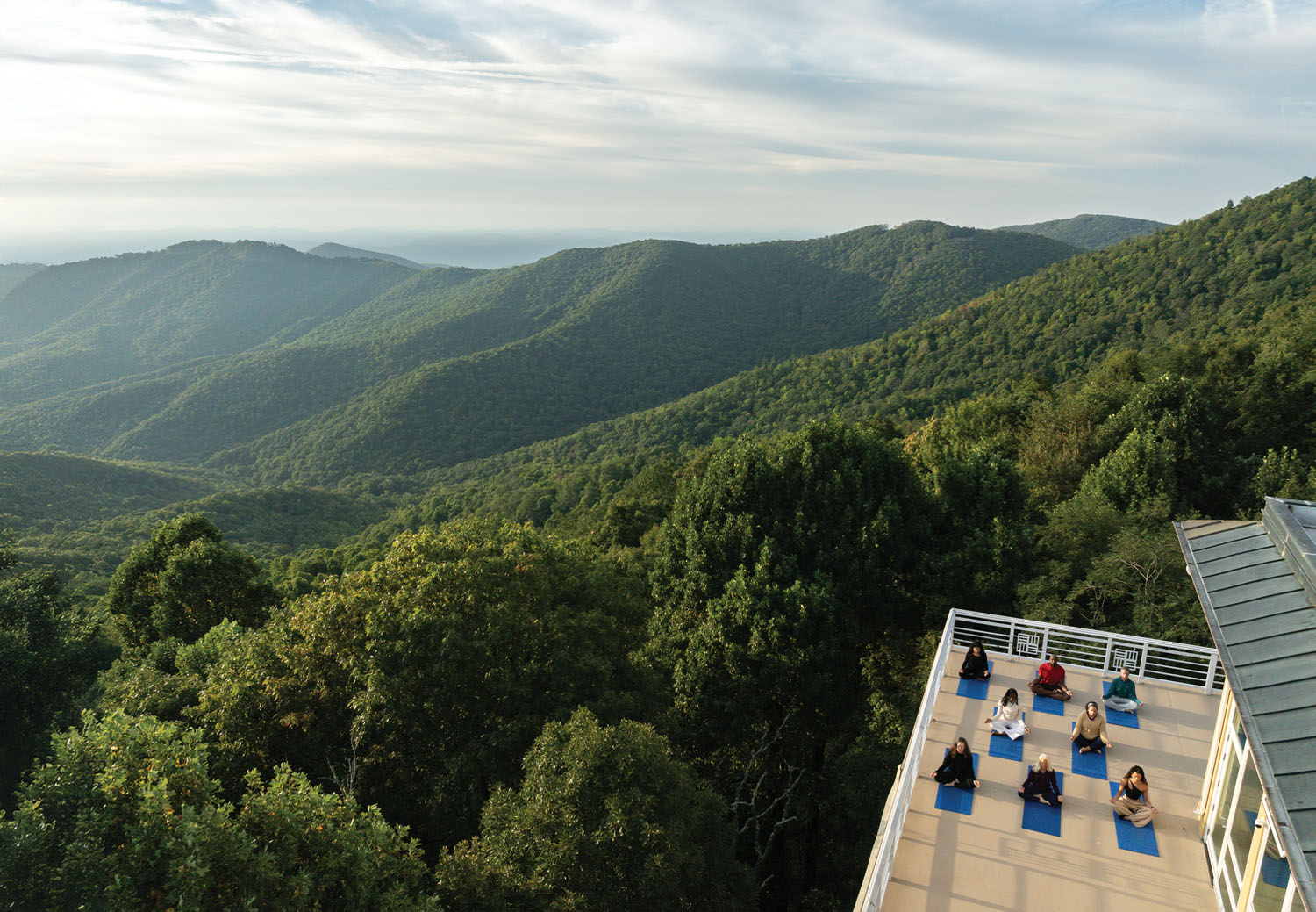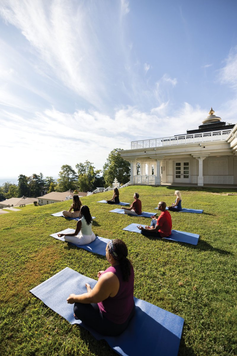 Visitors to the Art of Living Retreat Center practice meditation from a tranquil and secluded perch nestled on 380 forested acres in the Blue Ridge Mountains.