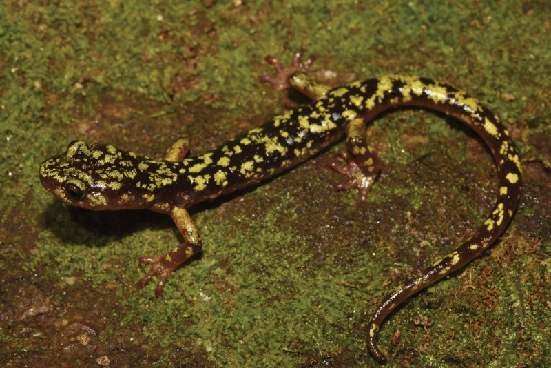 Marbled green-yellow and black skin camouflages the critter against the mossy, rocky outcroppings and crevices of the gorge. This salamander is lungless, breathing instead through its skin. Its lack of lungs also enables it to flatten into small crevices and remain unseen in trees.